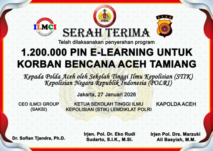 Aceh – Pemerintah Aceh mengapresiasi dukungan Sekolah Tinggi Ilmu Kepolisian (STIK) Lemdiklat Polri bersama ILMCI Group yang menyalurkan bantuan sebanyak 1,2 juta PIN e-learning guna mendukung keberlanjutan pembelajaran mandiri bagi siswa korban bencana di Aceh.