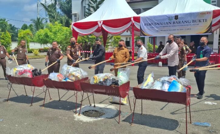 Aceh Utara – Kejaksaan Negeri (Kejari) Aceh Utara memusnahkan barang bukti tindak pidana yang telah berkekuatan hukum tetap (inkracht) di halaman kantor Kejari Aceh Utara, Rabu (28/4).